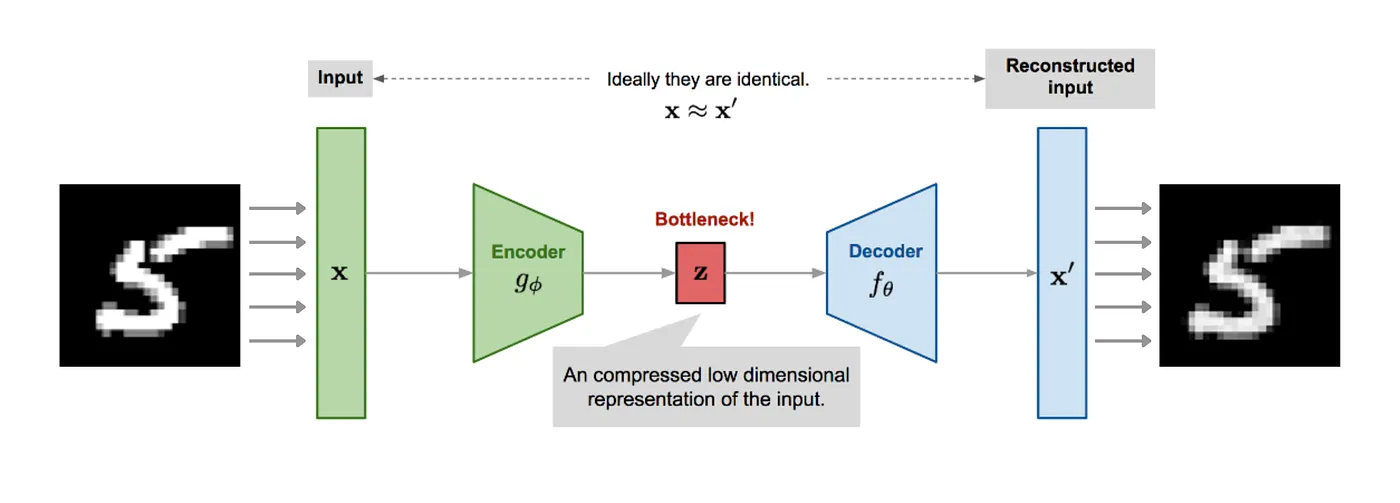 让我们从最早的自编码器 (Auto Encoder, AE) 开始一步一步谈起. AE 是一类能够把图片压缩成较短的向量的神经网络模型. 包含两部分: